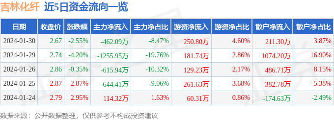 股票行情快报:吉林化纤(000420)1月30日主力资金净卖出462.09万元