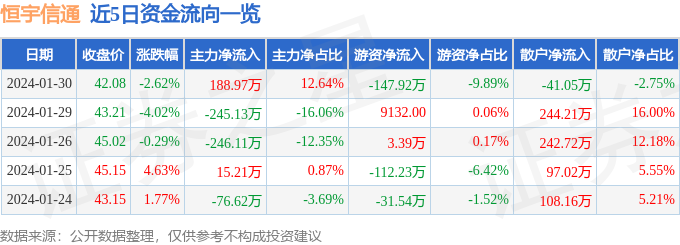 1月30日的资金流向数据方面,主力资金净流入188.97万元,占总成交额12.64%,游资资金净流出147.92万元,占总成交额9.89%,散户资金净流出41.05万元,占总成交额2.75%。