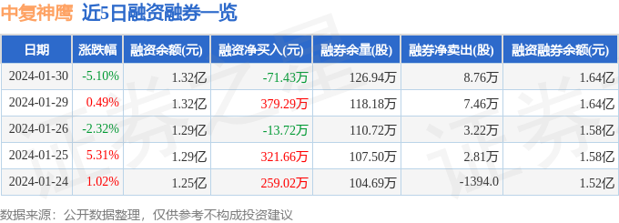 中复神鹰融资融券信息显示,融资方面,当日融资买入235.2万元,融资偿还306.63万元,融资净偿还71.43万元。融券方面,融券卖出11.49万股,融券偿还2.73万股,融券余量126.94万股,融券余额3210.34万元。融资融券余额1.64亿元。近5日融资融券数据一览见下表: