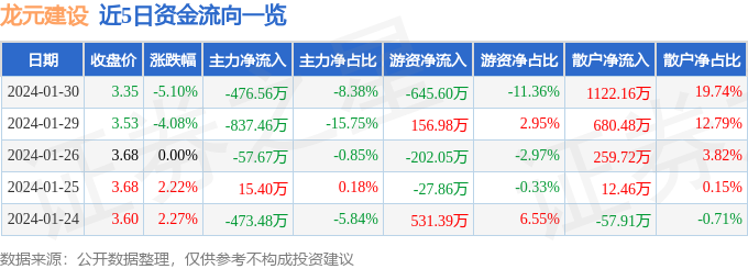 龙元建设(600491)1月30日主力资金净卖出476.56万元