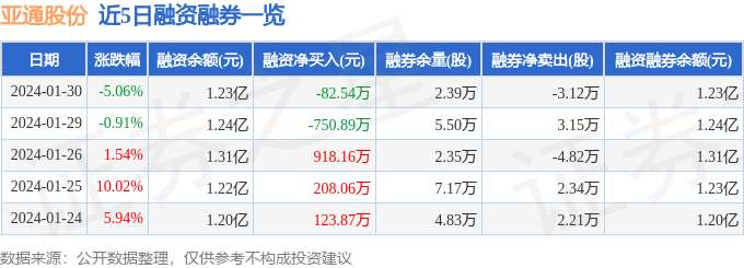 亚通股份融资融券信息显示,融资方面,当日融资买入570.2万元,融资偿还652.73万元,融资净偿还82.54万元。融券方面,融券卖出8400.0股,融券偿还3.96万股,融券余量2.39万股,融券余额14.79万元。融资融券余额1.23亿元。近5日融资融券数据一览见下表:
