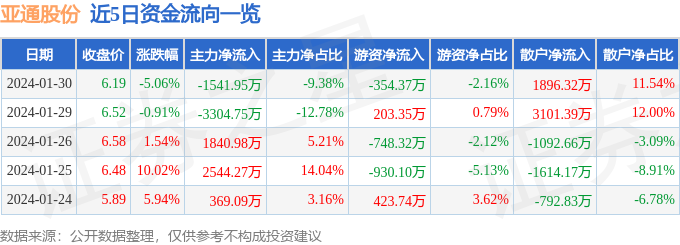 财经消息,截至2024年1月30日收盘,亚通股份(600692)报收于6.19元,下跌5.06%,换手率10.2%,成交量26.01万手,成交额1.64亿元。