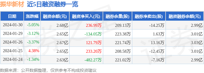 振华新材融资融券信息显示,融资方面,当日融资买入560.08万元,融资偿还323.08万元,融资净买入236.99万元。融券方面,融券卖出4.52万股,融券偿还18.77万股,融券余量209.13万股,融券余额3143.19万元。融资融券余额2.99亿元。近5日融资融券数据一览见下表: