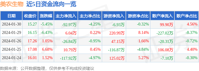 美农生物(301156)1月30日主力资金净卖出92.97万元