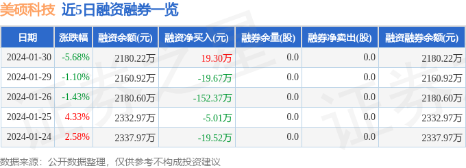 美硕科技融资融券信息显示,融资方面,当日融资买入49.24万元,融资偿还29.94万元,融资净买入19.3万元。融券方面,融券卖出0.0股,融券偿还0.0股,融券余量0.0股,融券余额0.0万元。融资融券余额2180.22万元。近5日融资融券数据一览见下表: