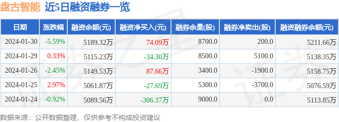 财经消息,截至2024年1月30日收盘,盘古智能(301456)报收于25.67元,下跌5.59%,换手率3.26%,成交量1.19万手,成交额3123.86万元。