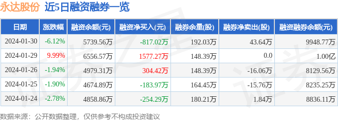 永达股份融资融券信息显示,融资方面,当日融资买入3382.7万元,融资偿还4199.72万元,融资净偿还817.02万元。融券方面,融券卖出61.4万股,融券偿还17.76万股,融券余量192.03万股,融券余额4209.22万元。融资融券余额9948.77万元。近5日融资融券数据一览见下表: