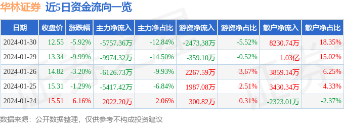 华林证券(002945)1月30日主力资金净卖出5757.36万元