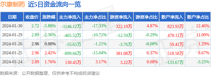 财经消息,截至2024年1月30日收盘,尔康制药(300267)报收于2.72元,下跌5.88%,换手率1.68%,成交量23.87万手,成交额6614.1万元。