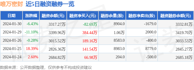 财经消息,截至2024年1月30日收盘,唯万密封(301161)报收于17.46元,下跌6.43%,换手率4.25%,成交量2.26万手,成交额3991.79万元。