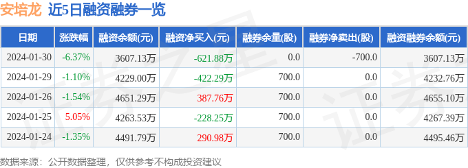 安培龙融资融券信息显示,融资方面,当日融资买入585.76万元,融资偿还1207.63万元,融资净偿还621.88万元。融券方面,融券卖出0.0股,融券偿还700.0股,融券余量0.0股,融券余额0.0万元。融资融券余额3607.13万元。近5日融资融券数据一览见下表: