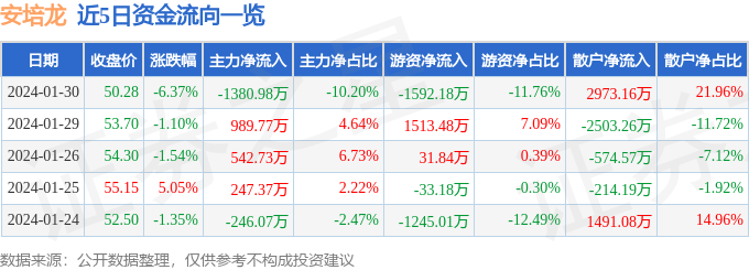 1月30日的资金流向数据方面,主力资金净流出1380.98万元,占总成交额10.2%,游资资金净流出1592.18万元,占总成交额11.76%,散户资金净流入2973.16万元,占总成交额21.96%。