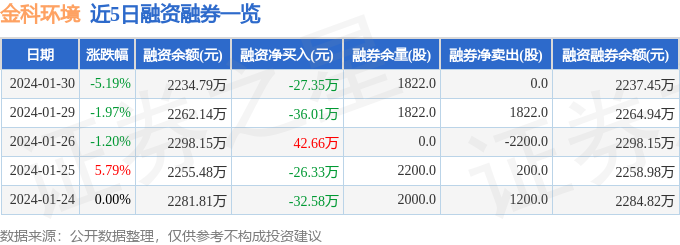 金科环境融资融券信息显示,融资方面,当日融资买入46.6万元,融资偿还73.95万元,融资净偿还27.35万元。融券方面,融券卖出0.0股,融券偿还0.0股,融券余量1822.0股,融券余额2.66万元。融资融券余额2237.45万元。近5日融资融券数据一览见下表: