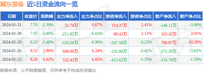 财经消息,截至2024年1月31日收盘,冀东装备(000856)报收于7.76元,下跌2.39%,换手率2.65%,成交量6.01万手,成交额4750.13万元。