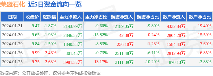 财经消息,截至2024年1月31日收盘,荣盛石化(002493)报收于9.47元,下跌1.87%,换手率0.25%,成交量23.43万手,成交额2.23亿元。