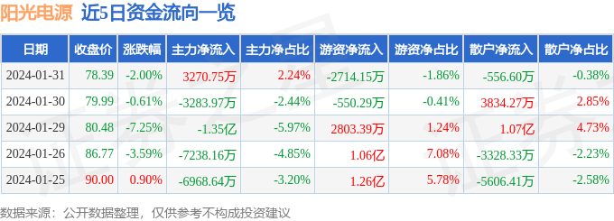 财经消息,截至2024年1月31日收盘,阳光电源(300274)报收于78.39元,下跌2.0%,换手率1.64%,成交量18.45万手,成交额14.58亿元。