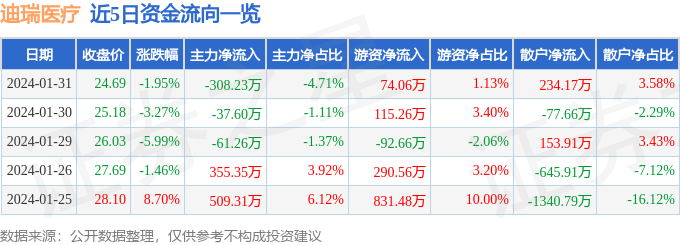 股票行情快报:迪瑞医疗(300396)1月31日主力资金净卖出308.23万元