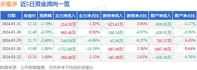 财经消息,截至2024年1月31日收盘,多氟多(002407)报收于12.14元,下跌2.1%,换手率1.35%,成交量13.01万手,成交额1.63亿元。