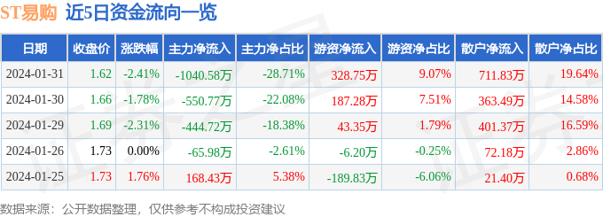 股票行情快报:ST易购(002024)1月31日主力资金净卖出1040.58万元