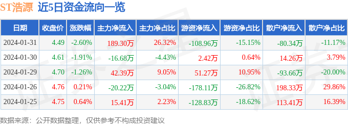 股票行情快报:ST浩源(002700)1月31日主力资金净买入189.30万元