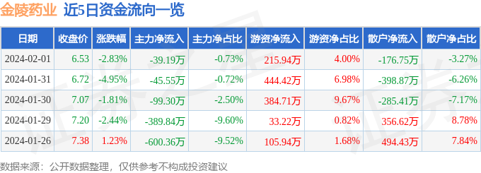 股票行情快报:金陵药业(000919)2月1日主力资金净卖出39.19万元
