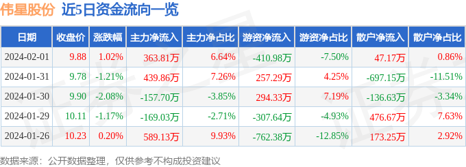 股票行情快报:伟星股份(002003)2月1日主力资金净买入363.81万元