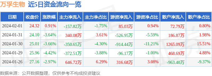 财经消息,截至2024年2月1日收盘,万孚生物(300482)报收于24.0元,下跌0.41%,换手率0.1%,成交量3428.0手,成交额821.83万元。
