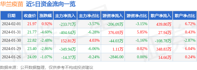 股票行情快报:华兰疫苗(301207)2月1日主力资金净卖出233.71万元