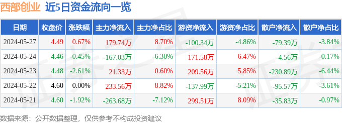 5月27日的资金流向数据方面,主力资金净流入179.74万元,占总成交额8.7%,游资资金净流出100.34万元,占总成交额4.86%,散户资金净流出79.39万元,占总成交额3.84%。