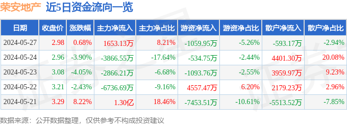 财经消息,截至2024年5月27日收盘,荣安地产(000517)报收于2.98元,上涨0.68%,换手率2.76%,成交量68.73万手,成交额2.01亿元。
