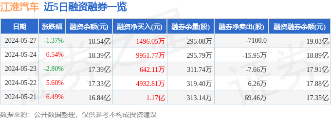 江淮汽车融资融券信息显示,融资方面,当日融资买入1.89亿元,融资偿还1.74亿元,融资净买入1496.05万元,连续3日净买入累计1.21亿元。融券方面,融券卖出10.13万股,融券偿还10.84万股,融券余量295.08万股,融券余额4880.55万元。融资融券余额19.03亿元。近5日融资融券数据一览见下表: