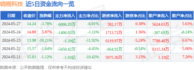 财经消息,截至2024年5月27日收盘,晓程科技(300139)报收于14.24元,下跌3.78%,换手率30.1%,成交量70.33万手,成交额9.99亿元。