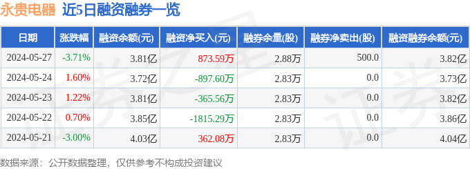 永贵电器融资融券信息显示,融资方面,当日融资买入3143.5万元,融资偿还2269.91万元,融资净买入873.59万元。融券方面,融券卖出500.0股,融券偿还0.0股,融券余量2.88万股,融券余额49.31万元。融资融券余额3.82亿元。近5日融资融券数据一览见下表: