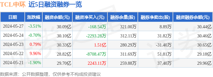TCL中环融资融券信息显示,融资方面,当日融资买入1.71亿元,融资偿还1.72亿元,融资净偿还168.54万元。融券方面,融券卖出16.57万股,融券偿还7.68万股,融券余量321.0万股,融券余额3524.55万元。融资融券余额30.44亿元。近5日融资融券数据一览见下表: