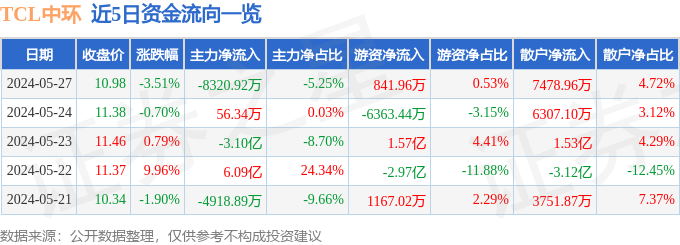 财经消息,截至2024年5月27日收盘,TCL中环(002129)报收于10.98元,下跌3.51%,换手率3.59%,成交量144.88万手,成交额15.86亿元。