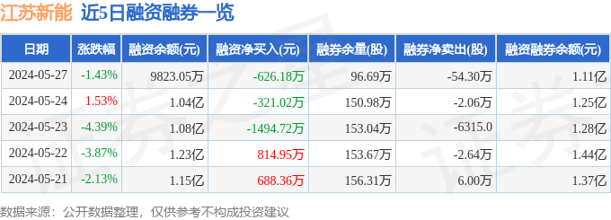 江苏新能融资融券信息显示,融资方面,当日融资买入1553.01万元,融资偿还2179.2万元,融资净偿还626.18万元。融券方面,融券卖出6.89万股,融券偿还61.19万股,融券余量96.69万股,融券余额1263.7万元。融资融券余额1.11亿元。近5日融资融券数据一览见下表: