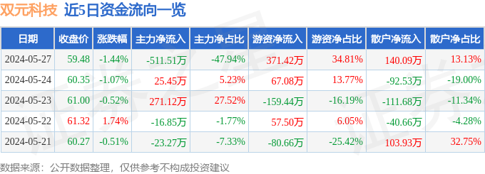 双元科技(688623)5月27日主力资金净卖出511.51万元