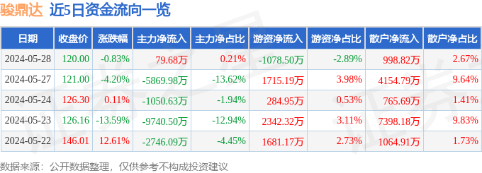股票行情快报:骏鼎达(301538)5月28日主力资金净买入79.68万元