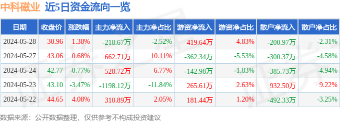 股票行情快报:中科磁业(301141)5月28日主力资金净卖出218.67万元