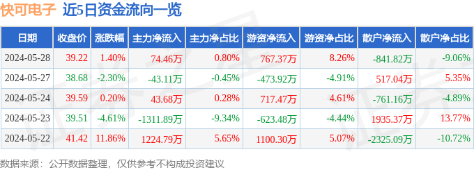 股票行情快报:快可电子(301278)5月28日主力资金净买入74.46万元