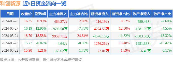 5月28日的资金流向数据方面,主力资金净流入464.27万元,占总成交额2.08%,游资资金净流入116.19万元,占总成交额0.52%,散户资金净流出580.46万元,占总成交额2.6%。