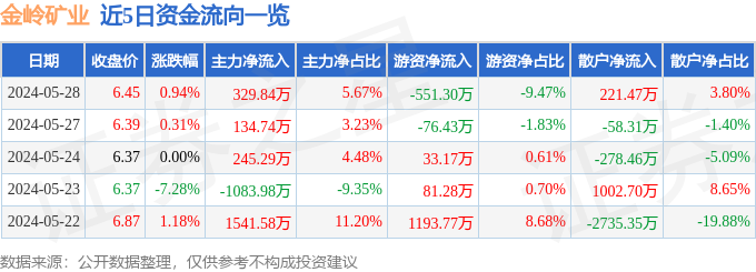 财经消息,截至2024年5月28日收盘,金岭矿业(000655)报收于6.45元,上涨0.94%,换手率1.51%,成交量8.96万手,成交额5821.55万元。
