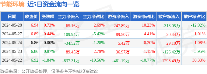 财经消息,截至2024年5月28日收盘,节能环境(300140)报收于6.94元,上涨0.73%,换手率0.83%,成交量3.5万手,成交额2422.19万元。