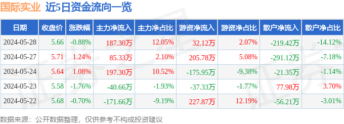 股票行情快报:国际实业(000159)5月28日主力资金净买入187.30万元