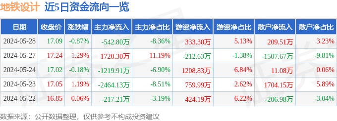 股票行情快报:地铁设计(003013)5月28日主力资金净卖出542.80万元
