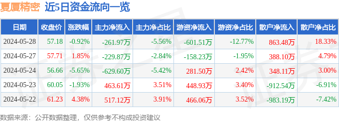 股票行情快报:夏厦精密(001306)5月28日主力资金净卖出261.97万元