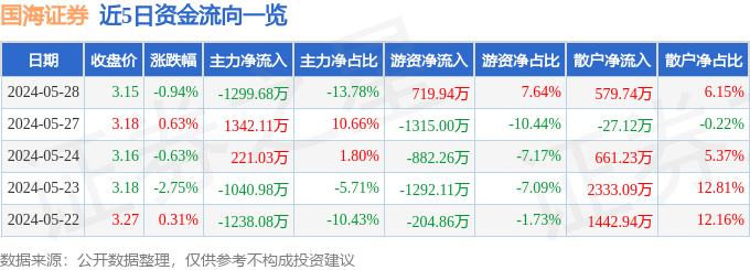 财经消息,截至2024年5月28日收盘,国海证券(000750)报收于3.15元,下跌0.94%,换手率0.51%,成交量29.8万手,成交额9428.32万元。