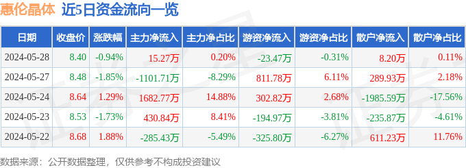 财经消息,截至2024年5月28日收盘,惠伦晶体(300460)报收于8.4元,下跌0.94%,换手率3.18%,成交量8.92万手,成交额7576.66万元。