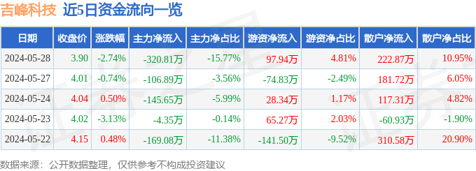 5月28日的资金流向数据方面,主力资金净流出320.81万元,占总成交额15.77%,游资资金净流入97.94万元,占总成交额4.81%,散户资金净流入222.87万元,占总成交额10.95%。