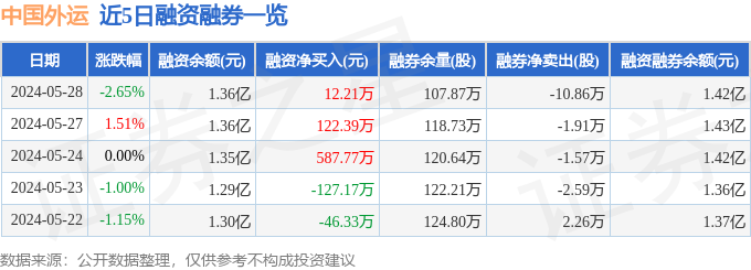中国外运融资融券信息显示,融资方面,当日融资买入1228.28万元,融资偿还1216.07万元,融资净买入12.21万元,连续3日净买入累计722.36万元。融券方面,融券卖出10.67万股,融券偿还21.53万股,融券余量107.87万股,融券余额634.28万元。融资融券余额1.42亿元。近5日融资融券数据一览见下表: